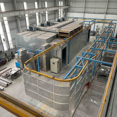 Βιομηχανικό σύστημα επεξεργασίας υλικών που κατευθύνει μεταλλικά εξαρτήματα μέσω καθαρής επίστρωσης σκόνης και εγκαταστάσεων παραγωγής.
